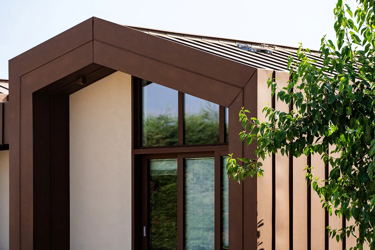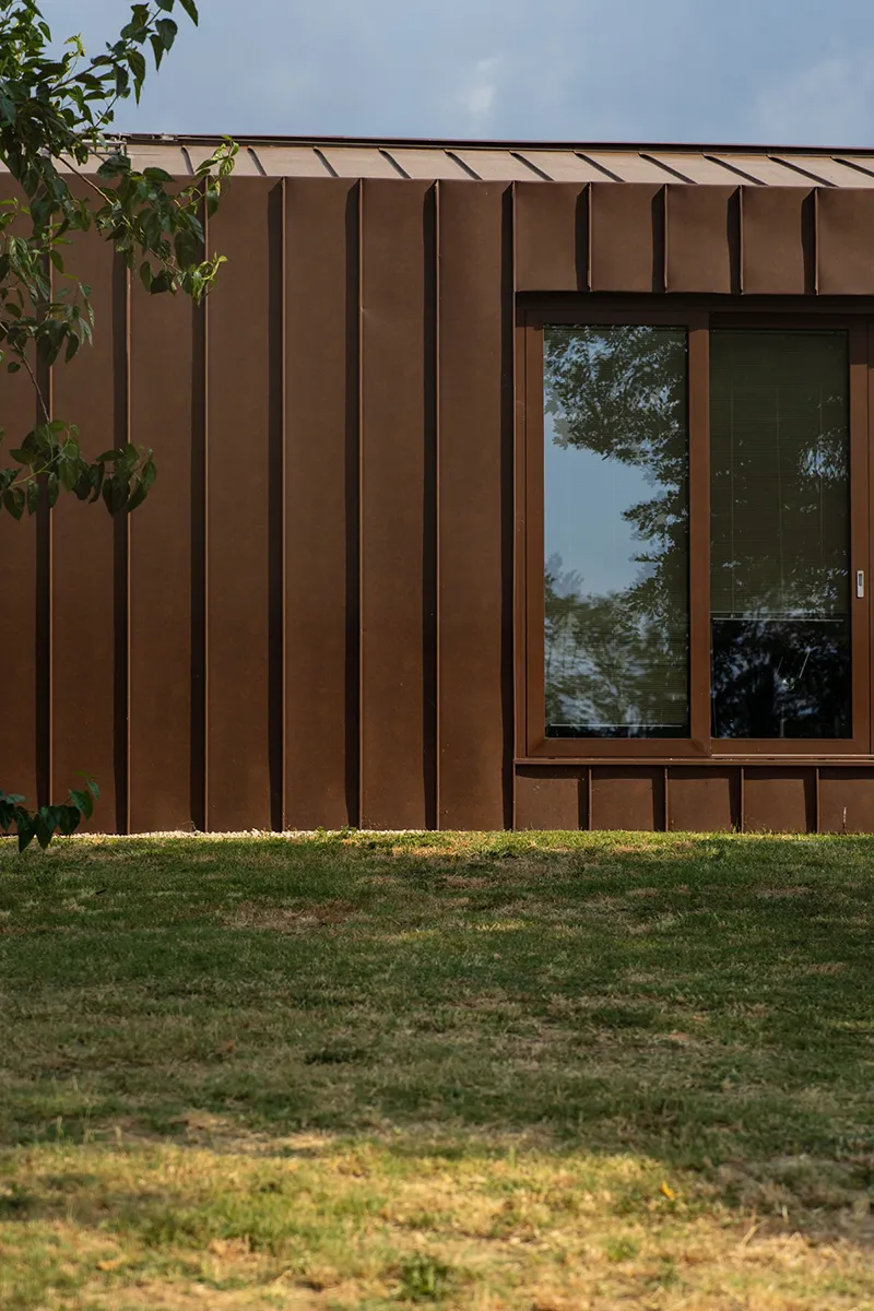 La continuità tra copertura e facciata è uno degli aspetti più significativi dell’intervento: la pelle metallica avvolge l’intero volume senza soluzione di continuità, eliminando la distinzione percettiva tra tetto e parete e trasformando il rivestimento in un unico mantello protettivo. La tecnica dell’aggraffatura, con le sue linee verticali scandite dalla giunzione delle lastre in vestis® Cortex, diventa linguaggio architettonico oltre che soluzione costruttiva; i fissaggi non a vista e la gestione controllata delle dilatazioni termiche garantiscono planarità, precisione e durata, restituendo superfici rigorose e coerenti con l’impianto volumetrico compatto.
