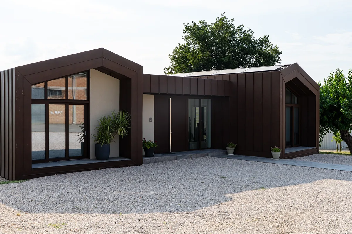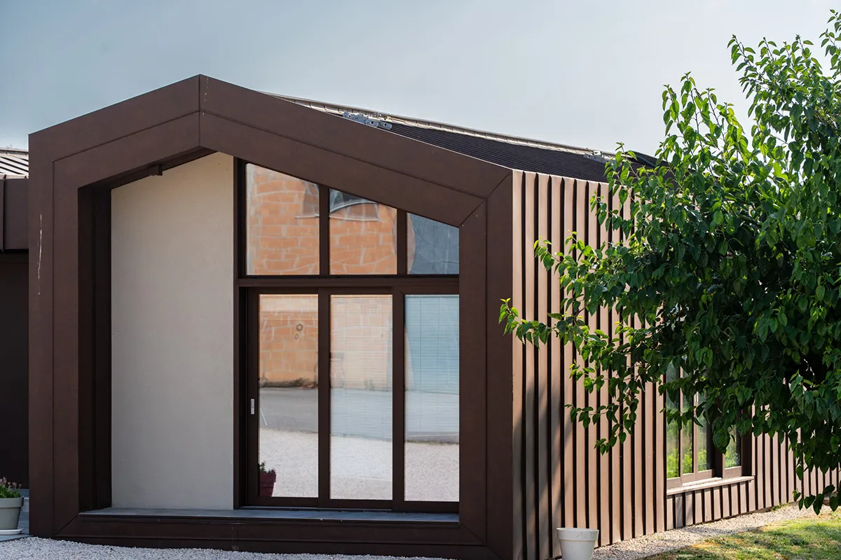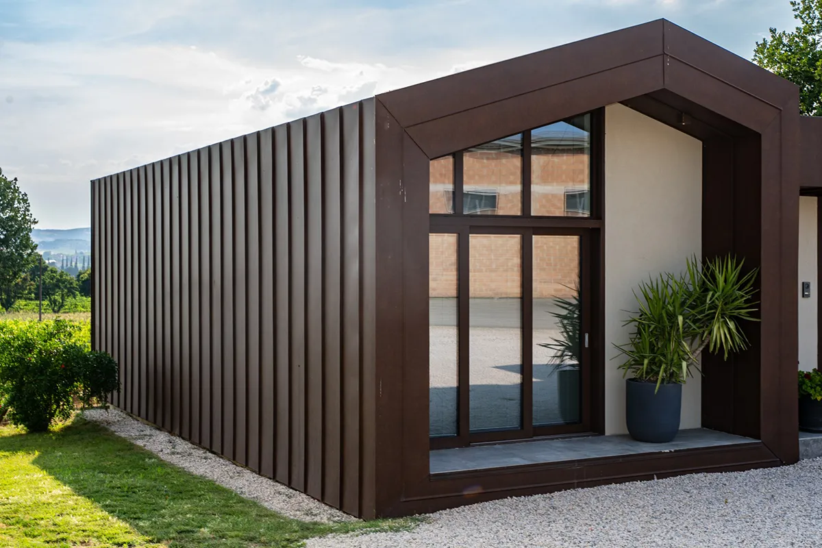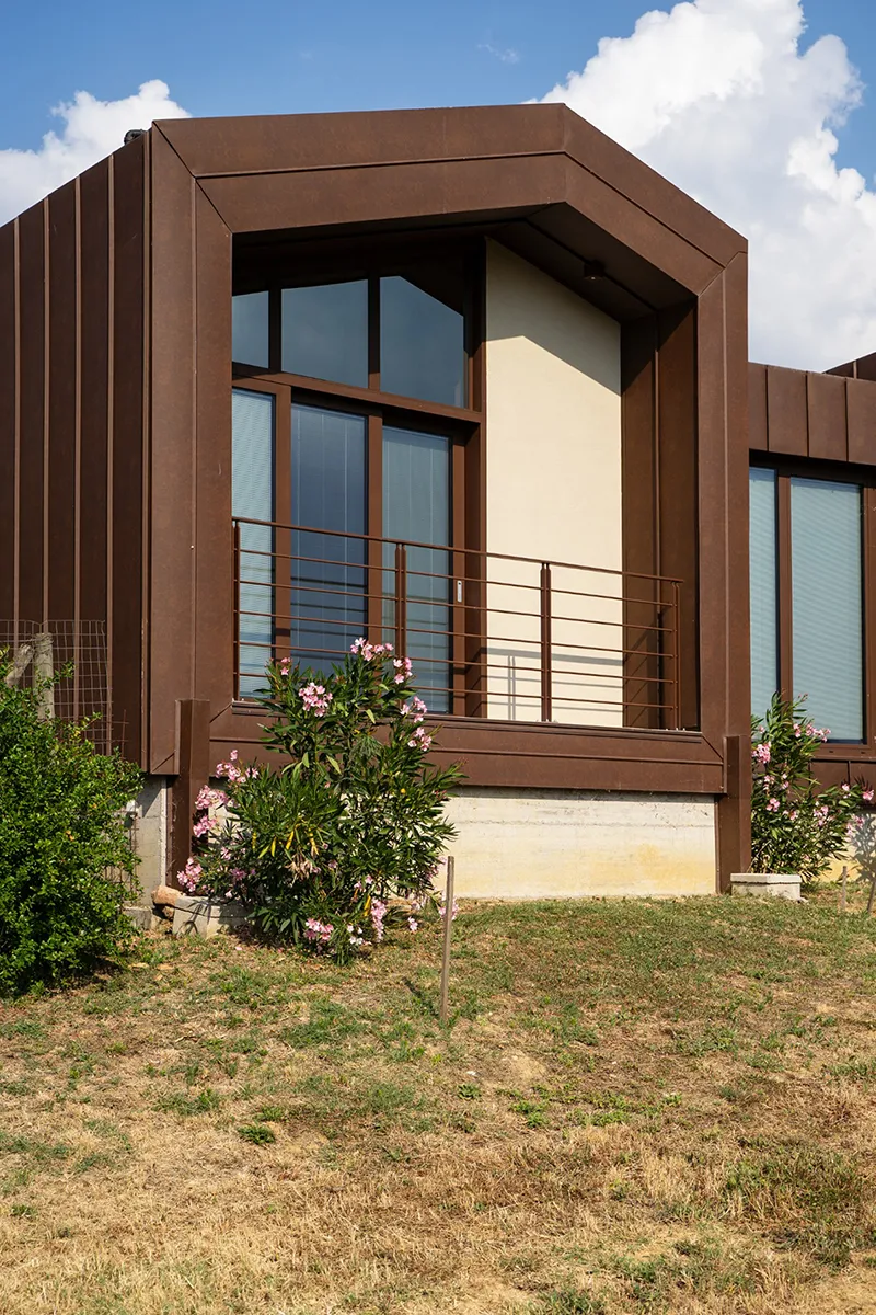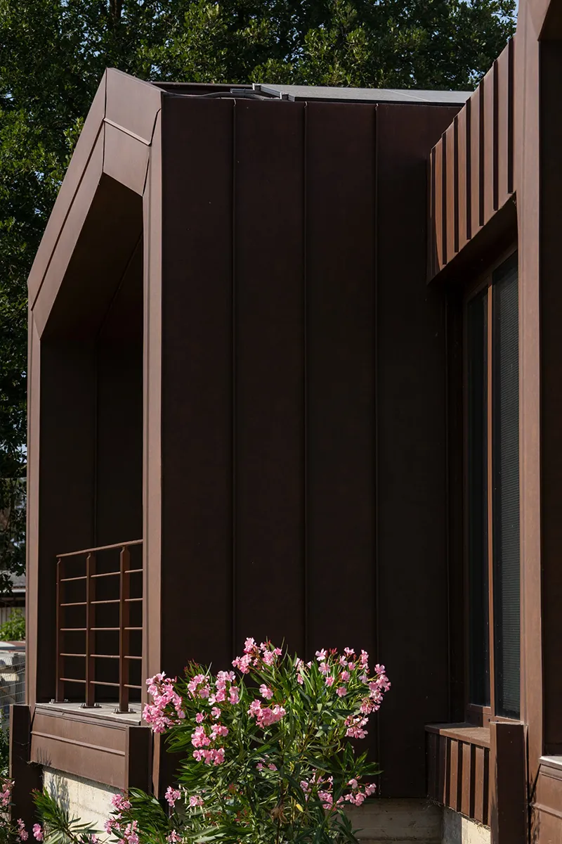 Il rivestimento scelto è il Vestis® Cortex di Mazzonetto Spa, un alluminio preverniciato che riproduce fedelmente l'estetica dell'acciaio Cor-Ten senza i problemi di ossidazione. Questo metallo è apprezzato per la sua resistenza alle intemperie, agli agenti atmosferici e la sua durabilità nel tempo senza manutenzione.