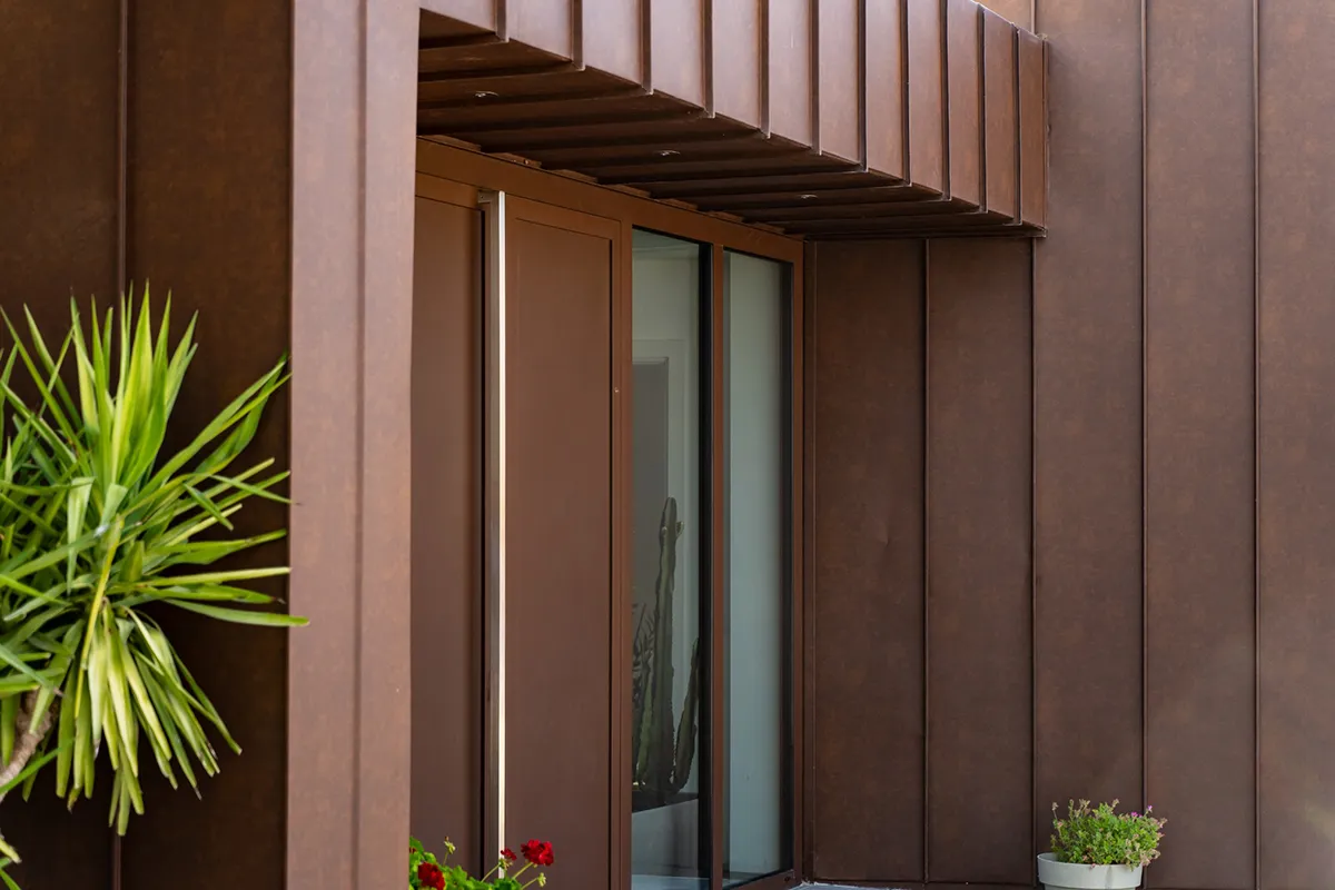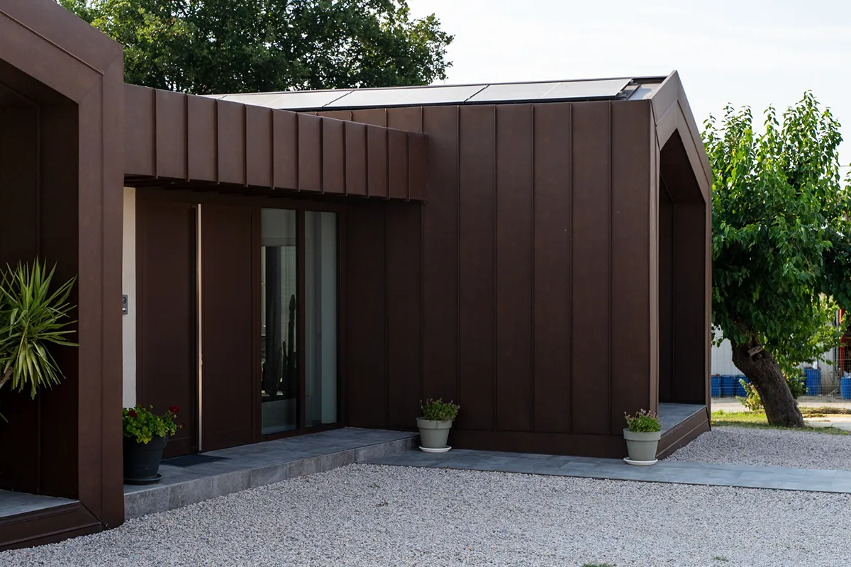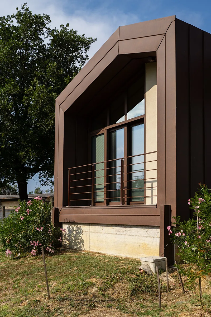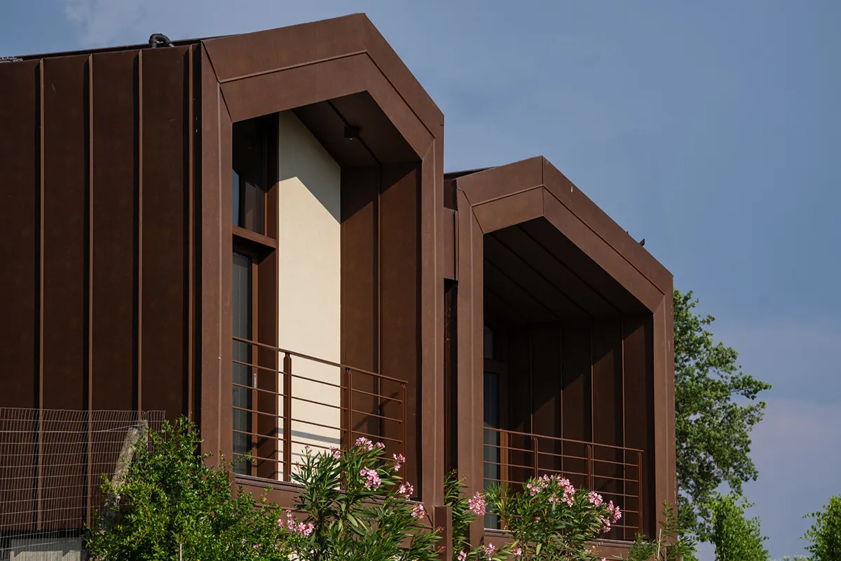 Il rivestimento scelto è il Vestis® Cortex di Mazzonetto Spa, un alluminio preverniciato che riproduce fedelmente l'estetica dell'acciaio Cor-Ten senza i problemi di ossidazione. Questo metallo è apprezzato per la sua resistenza alle intemperie, agli agenti atmosferici e la sua durabilità nel tempo senza manutenzione.