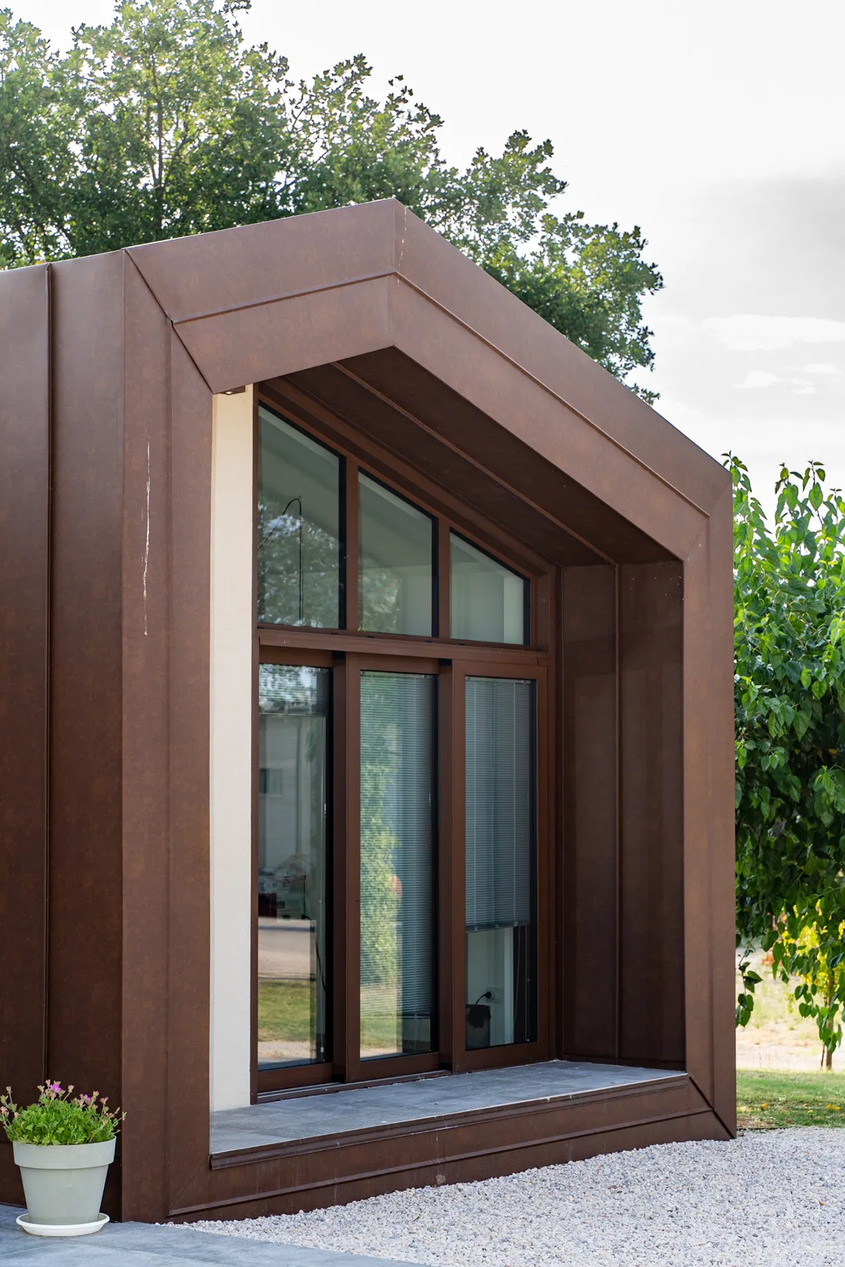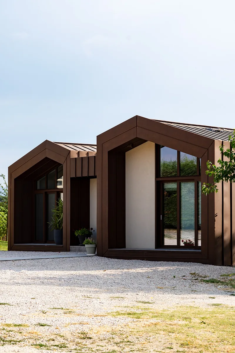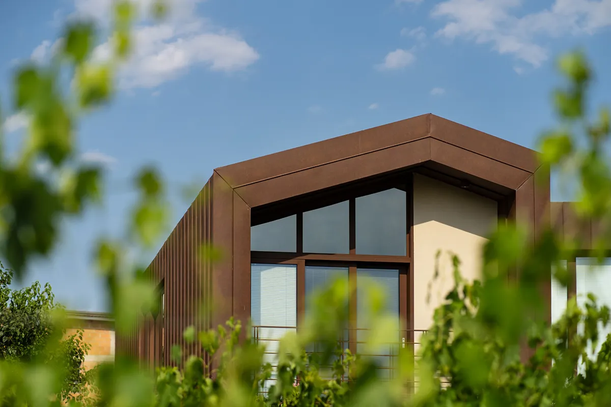 Il rivestimento scelto è il Vestis® Cortex di Mazzonetto Spa, un alluminio preverniciato che riproduce fedelmente l'estetica dell'acciaio Cor-Ten senza i problemi di ossidazione. Questo metallo è apprezzato per la sua resistenza alle intemperie, agli agenti atmosferici e la sua durabilità nel tempo senza manutenzione.